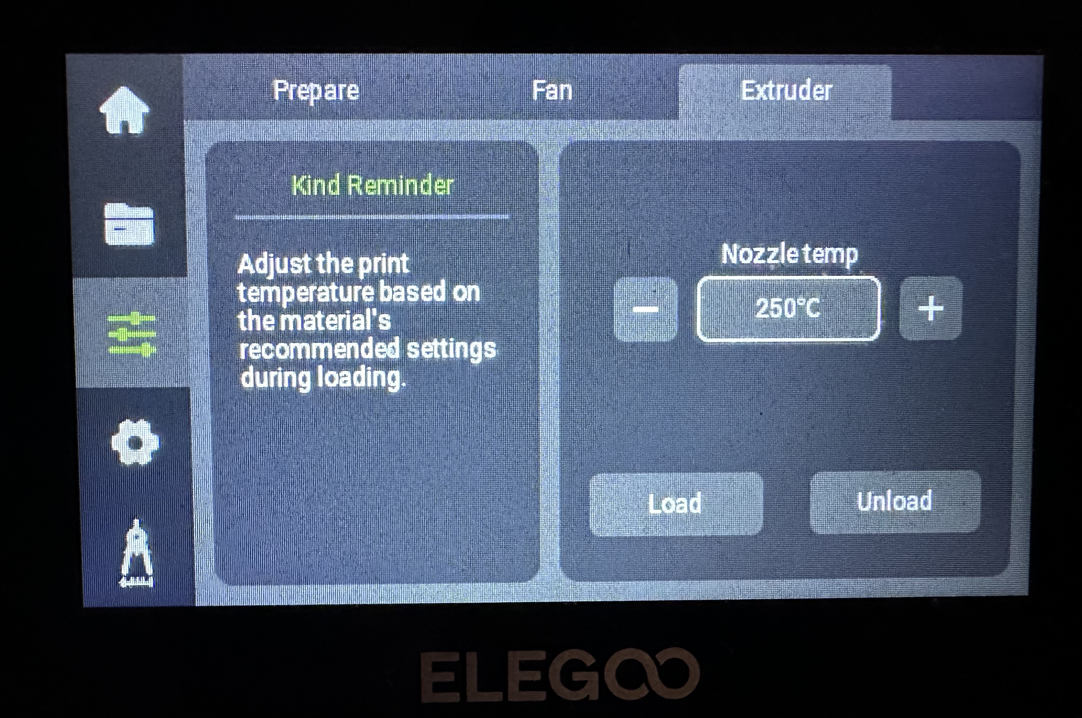 You also need filament. The most common type of filament used is Polylactic Acid, or PLA. You can order PLA with your printer from the manufacturer or you can order from Amazon. Once you have the filament, you will need to load it in to the printer. The CC has a side-mounted filament holder. You place the filament on the holder as shown in the setup instructions and feed the filament in to the printer. In the case of the CC, you simply push the end of the filament in to the sensor mounted on the side of the printer until it won't go any further. You then need to tell the printer to load the filament. This can be done on the attached screen by going to Setting, Extruder and clicking on Load as shown on the screenshot below.