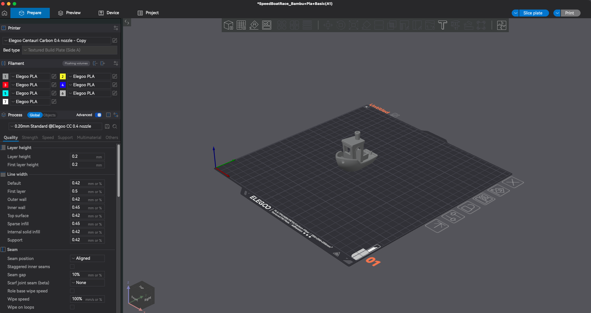 On the top right of the screen, click on Slice Plate. After a few seconds the model changes color and you see a bunch of information on the right of the screen. This tells you how much filament it will use and how long it will take to print. Next click on Print.